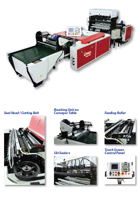 Limax Gapa bottom seal machine is designed for the high speed production of bottom seal bags over a wide range of film material and gauge. Equipped with the latest state of the art servo technology, machine can run clamped bags at speeds of up to 200cpm. Sealing jaws are fitted with Nichrome wires and cutting is by a flying knife. Machine can be equipped with a range of accessories such as handle punch, angle sealers, slit sealers and a bag brushing unit for thin gauge application. It is easy to operate, very reliable and requires minimal maintenance.