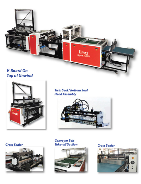 Limax Sigma side seal bag machine, incorporating a range of different accessories, converts a variety of side seal bags in polyethylene and polypropylene from tubular and sheet film. An optional twin seal / bottom seal assembly with a servo driven flying knife for cutting, allows the three different types of bag to be converted on this versatile machine.